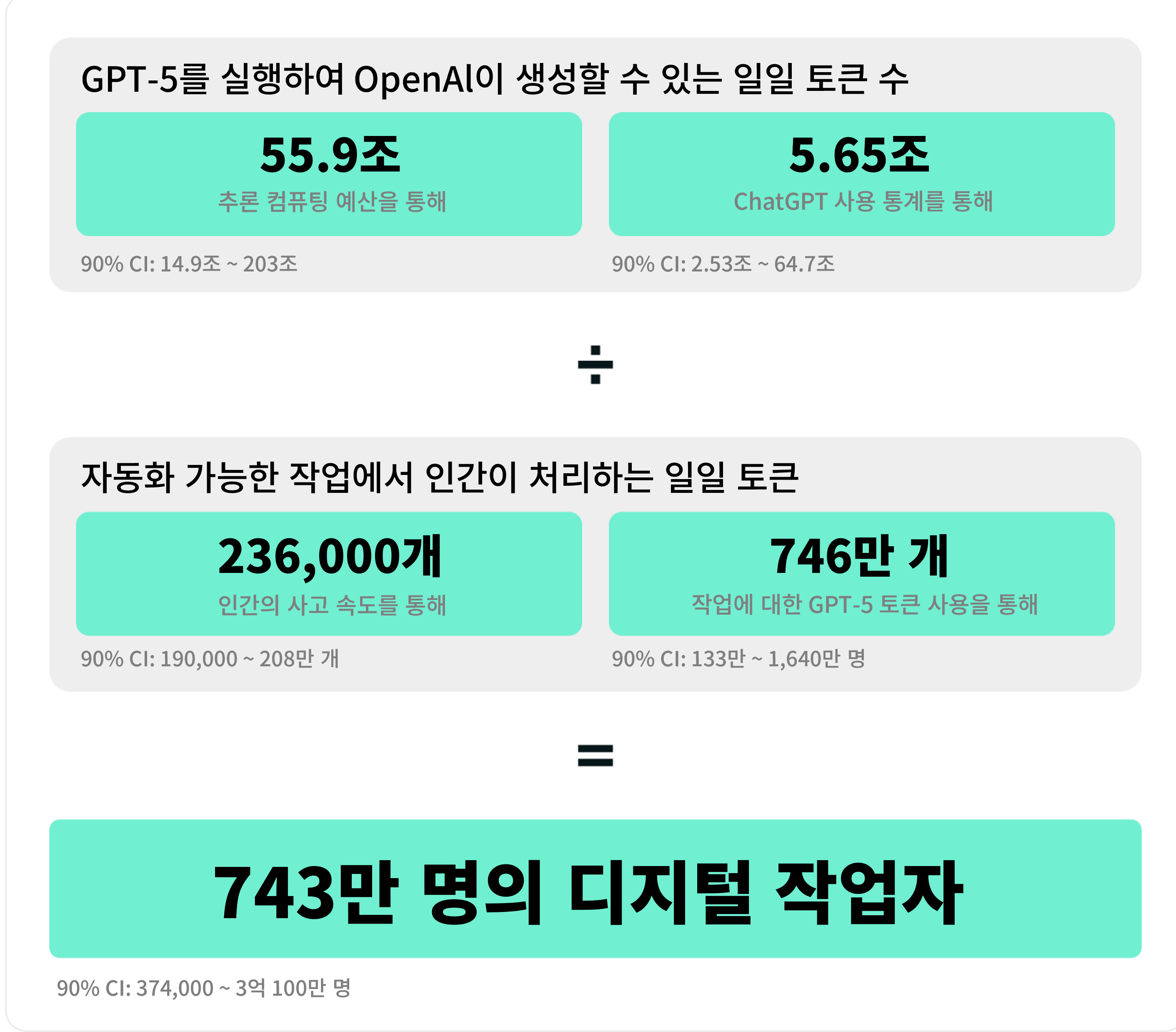 Epoch AI(2025.10. 3)는 OpenAI와 같은 기업이 중간값으로 약 700만 명의 디지털 노동자를 운영할 수 있는 하드웨어를 보유하고 있다고 추정합니다. 이 추정치는 매우 불확실하며, 90% 신뢰 구간은 최소 40만 명에서 최대 3억 명에 이릅니다. 이는 현재 세계 최대 고용 기업(월마트, 약 210만 명)을 훨씬 뛰어넘는 규모입니다.