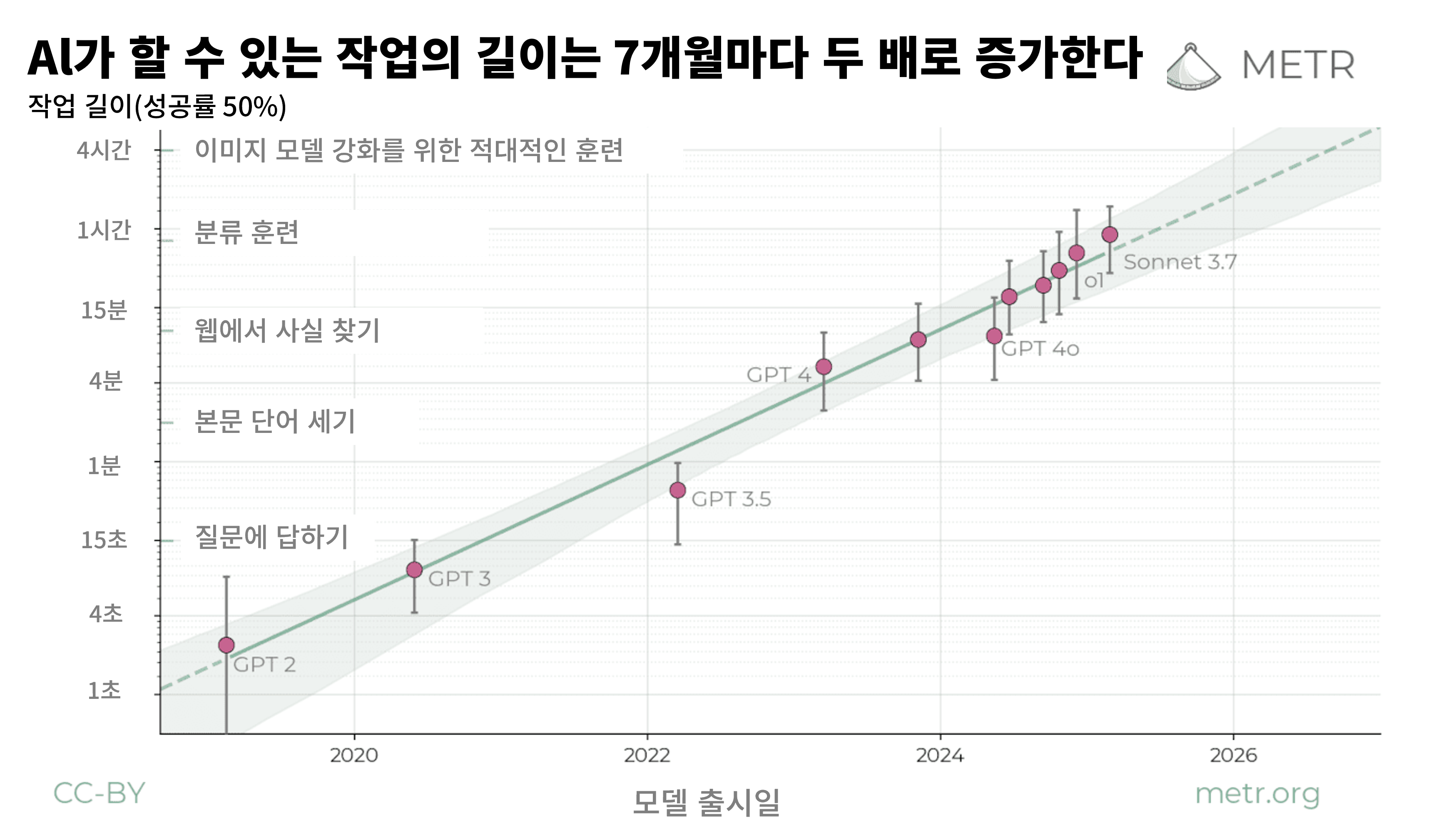더 무서운 건, AI 에이전트의 업무 완수률이 약 7개월마다 2배씩 높아지고 있다고?