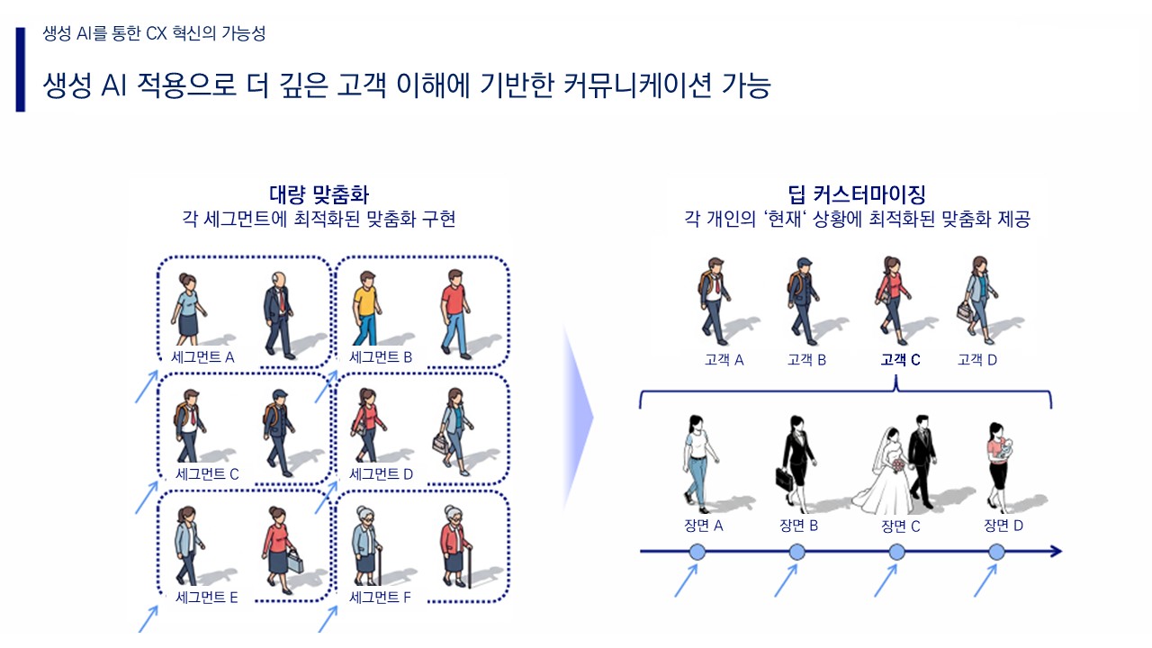 생성AI가 등장하면서, CX의 수준이 달라졌어요. 과거엔 세그먼트별로 메시지를 달리하는 '매스 커스터마이제이션'이 한계였죠. 이제는 개인의 '지금 이 순간'에 최적화된 '딥 커스터마이제이션'이 가능해졌습니다.