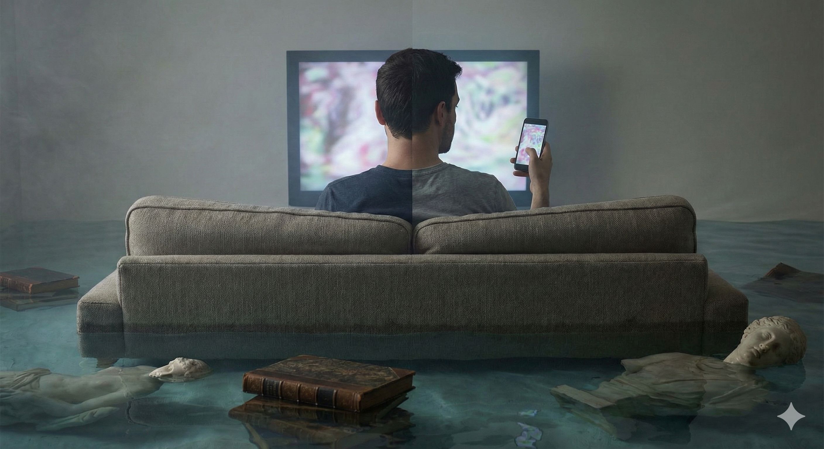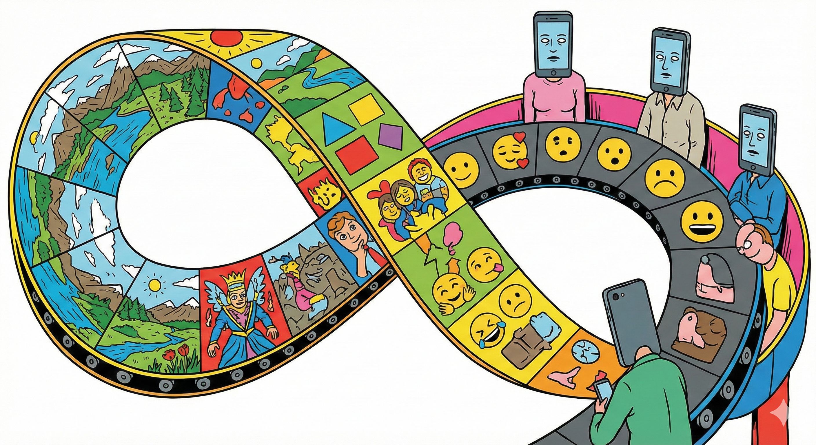PMC에 게재된 924명 대상 연구는 여러 미디어를 동시에 사용하는 습관과 집중력 저하 사이에 뚜렷한 상관관계(r=.20~.21)가 있음을 확인했습니다. TV를 보면서 스마트폰을 쓰는 것은 단순한 '동시 사용'이 아니라, 주의력의 질적 저하와 연결되어 있습니다. 콘텐츠가 단순해질수록 소비자의 주의력은 더 짧아지고, 주의력이 짧아질수록 콘텐츠는 더 단순해집니다. 악순환입니다.