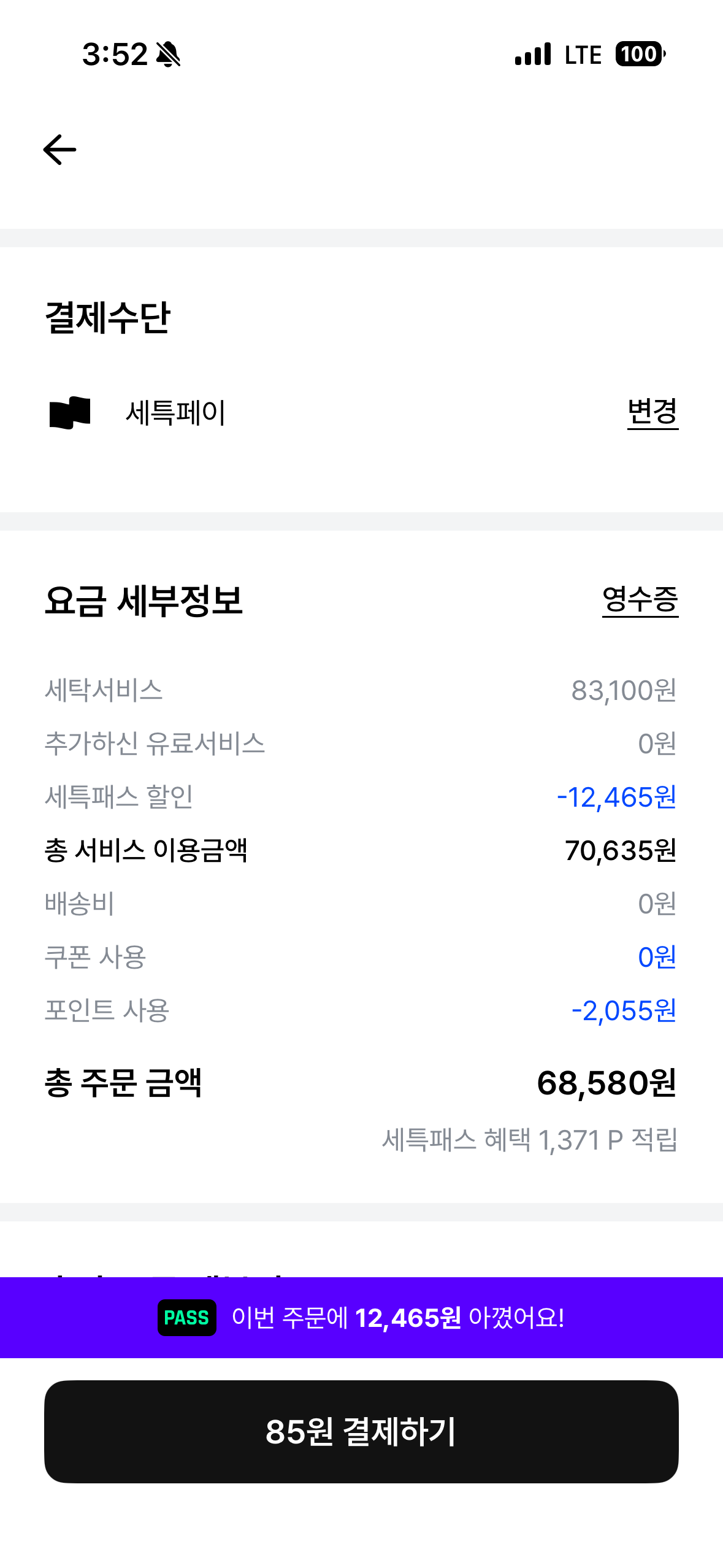저는 가까운 세탁소를 찾지 못해 세탁특공대의 주 이용자가 되었습니다. 그런데 언제나처럼 세특페이(등록된 신용카드)로 결제한 후 며칠이 지나도 세탁물이 오지 않았습니다. 어쩐 일인가 확인해보니 '85원'이 추가 청구되어 있었습니다. 결제하기를 눌렀으나, "100원 미만 금액은 결제가 되지 않습니다"라는 메시지만 떴습니다.