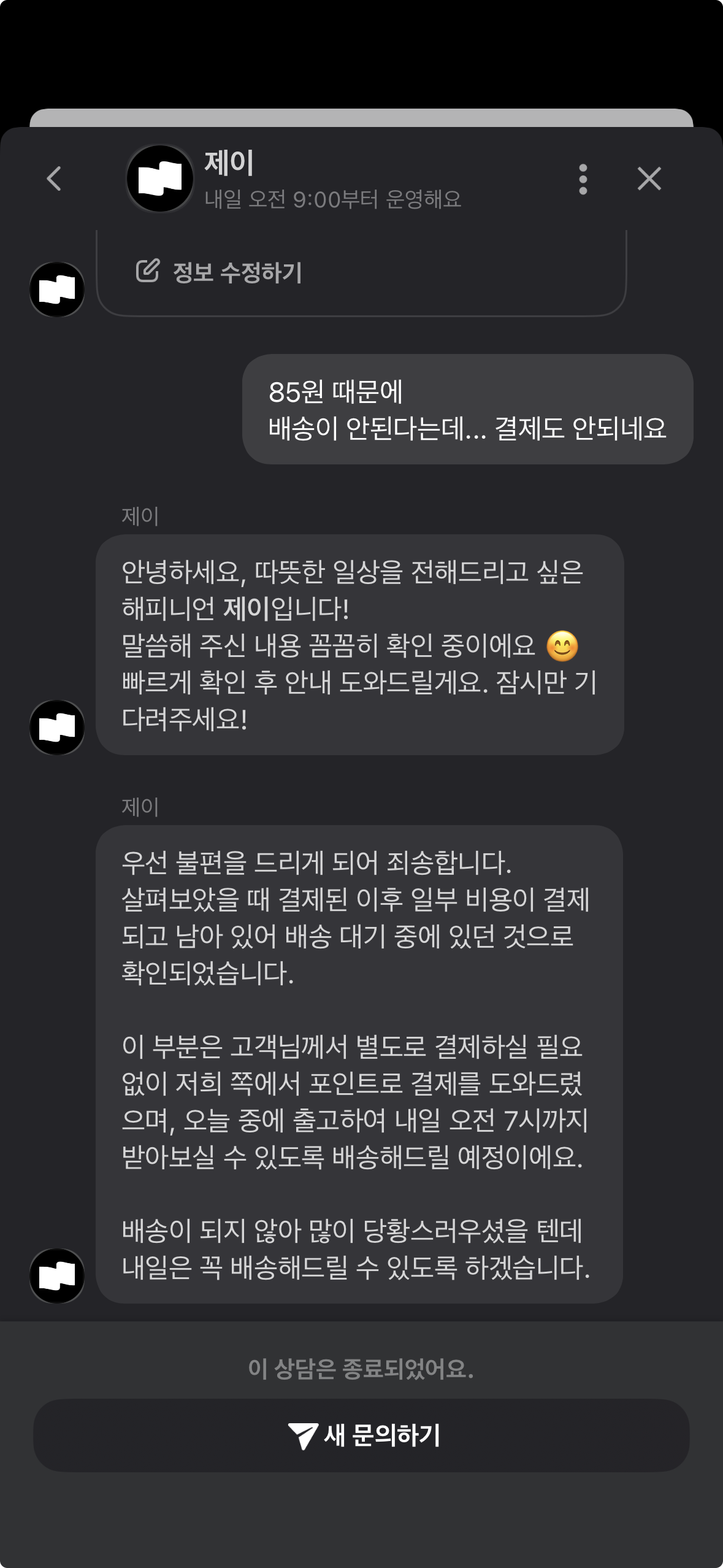 어떤 이유로 85원이 추가되었는지, 그리고 100원도 안 되는 금액인데 왜 자동 면제 처리가 되지 않았는지 궁금했습니다. 고객센터를 찾으니 저녁 6시가 넘은 시각, 채팅 상담밖에 되지 않았습니다. 보유 포인트로 빠르게 처리해주긴 했으나, 왜 이런 상황이 발생했는지에 대한 설명은 끝내 듣지 못했습니다.